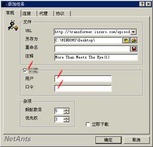 本站点所提供的该系列动画下载,是采用RealProducer制作、RealPlayer播放的RealVideo格式动画,每集动画所占空间大约在40兆至60兆之间,播放时间约在20分钟至25分钟之间;由于文件较大,且下载占用服务器带宽较大,所以为用户考虑,我们不建议家庭上网用户下载,家庭上网的金刚联盟会员,可以在今后的时间申请得到站长制作的这些动画CDR;如果你有能力下载这些动画,请使用断点下载工具NetAnts下载,切忌直接通过连接下载;关于RealVideo格式动画的播放器RealPlayer。在网络蚂蚁的任务中你可以添加下载口令,关于网络蚂蚁Netants添加口令的图片、网际快车Jetcar添加口令的图片。